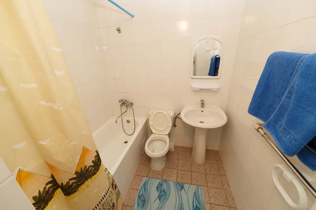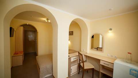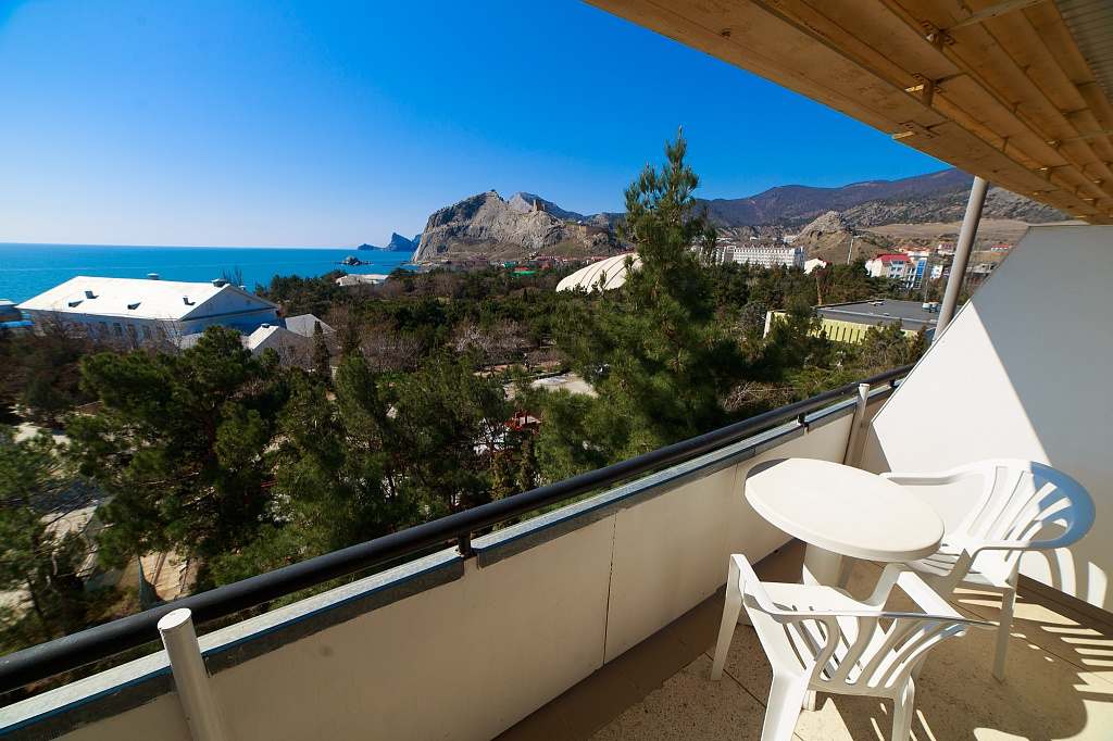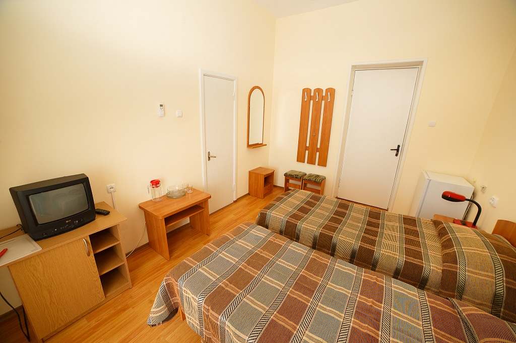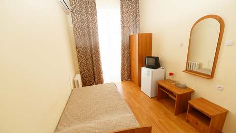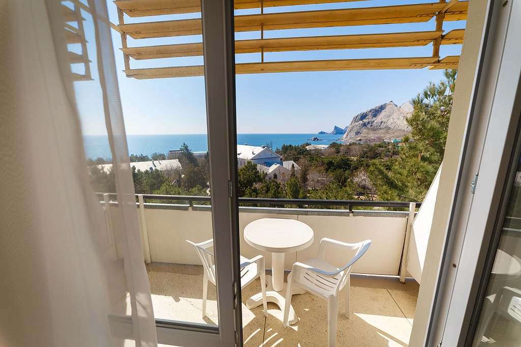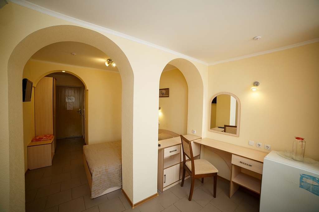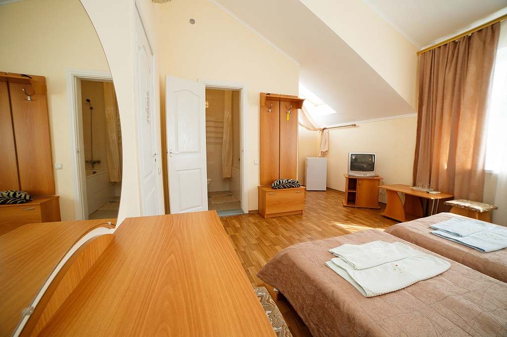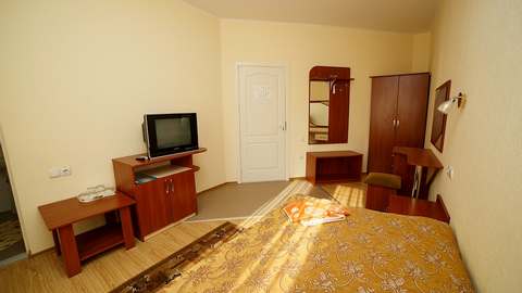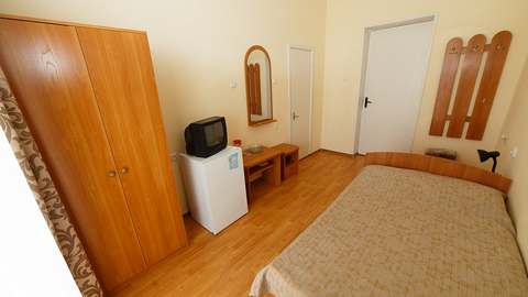 Номера с удобствами (совмещенный санузел с ванной). В номере: 2 раздельные кровати, телевизор, холодильник, кондиционер, набор мебели. Дополнительное место: еврораскладушка. Вид на море.