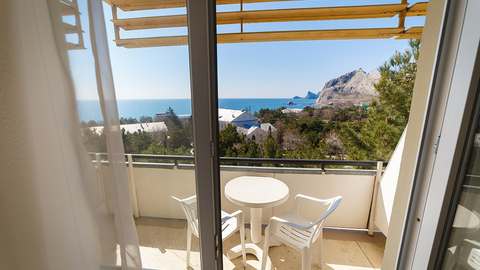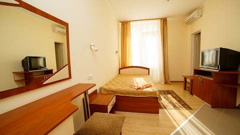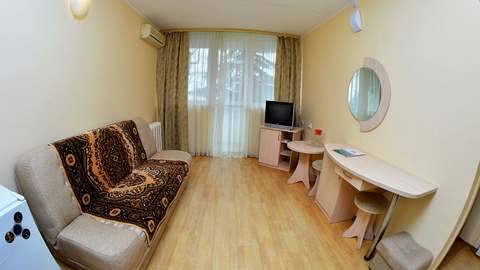 Номера с удобствами (совмещенный санузел с ванной, биде). В номере: 2 раздельные 1-спальные кровати, диван, телевизор, холодильник, кондиционер, набор мебели. Без балкона. Дополнительное место: раскладной диван. Вид на море.