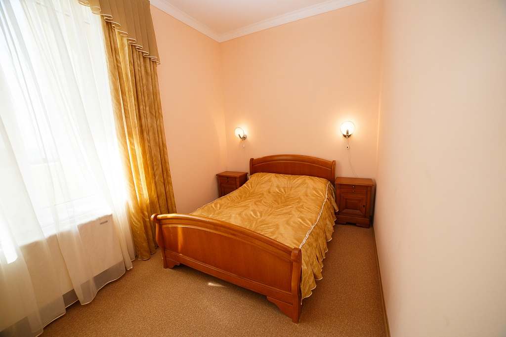 Номера с удобствами (совмещенный санузел с ванной). В номере: 2 раздельные кровати, телевизор, холодильник, кондиционер, набор мебели, вид на парковую территорию. Балконов нет. Дополнительное место: кровать. При реконструкции корпуса лоджию объединили с жилой комнатой, в связи с чем появилась небольшая комнатка, где и расположена дополнительная кровать.