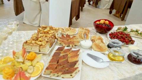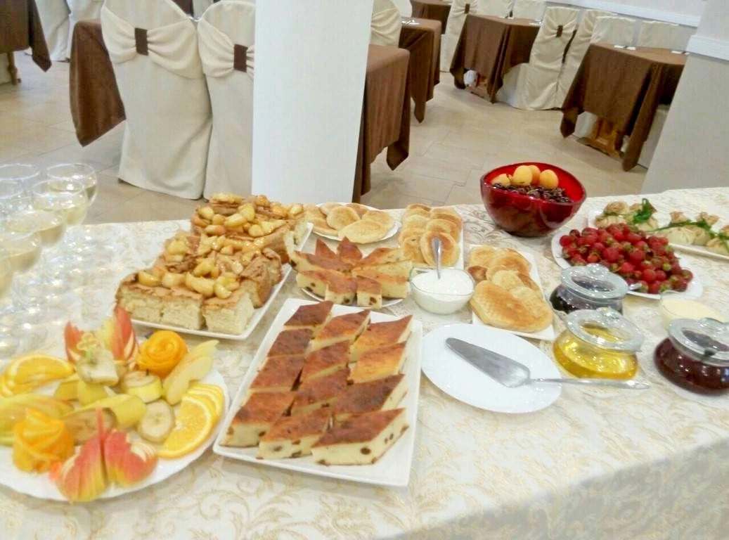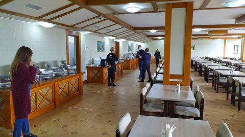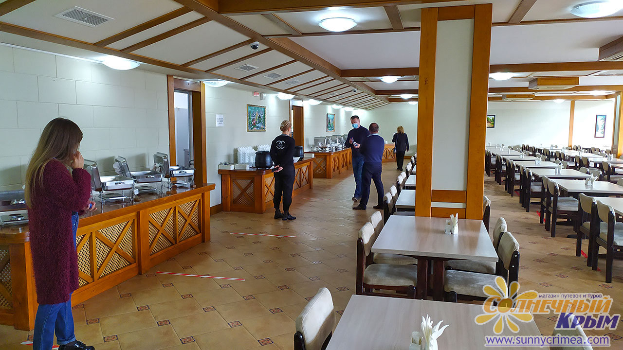 3-разовое питание по системе «шведский стол» в столовой санатория (в межсезонье при малой загрузке санатория возможен переход на заказное меню), диетическое питание с разделением на лечебные столы. На территории санатория также имеются летнее кафе и ресторан.