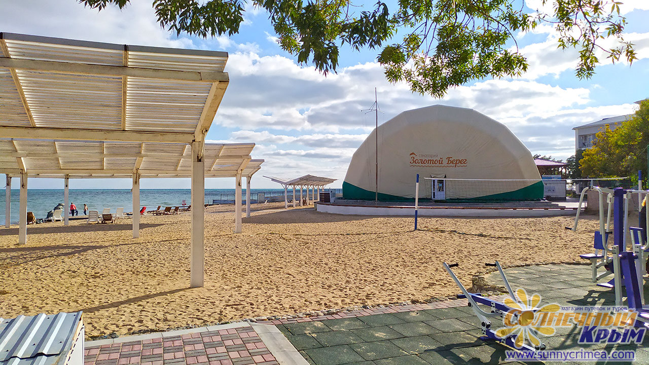 Санаторий «Золотой берег» расположен в самом центре курортного города Евпатория, на самом берегу Черного моря. Территория санатория занимает площадь более 4 га. В шаговой доступности от санатория расположены дельфинарий, аквариум, аттракционы, кафе, автодром и прочие развлечения на любой вкус.