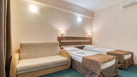 Площадь номера: 20 кв. м. В номере: двуспальная или две односпальные кровати, диван, кондиционер, телевизор, сейф, холодильник; санузел с душем, фен, минипарфюмерия. Номер без балкона, вид на парк. Дополнительных мест: 2 (раскладной диван). Размещение до 4 человек.