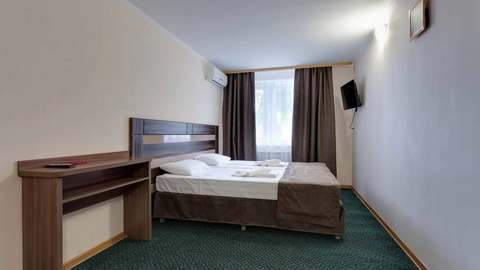 Площадь номера: 14 кв. м. В номере: одна двуспальная кровать, кондиционер, телевизор, сейф, холодильник; санузел с душем, фен, минипарфюмерия. Номер с балконом, видом на парк. Дополнительное место не предусмотрено. Размещение до 2 человек.