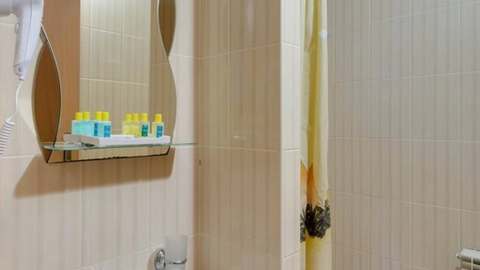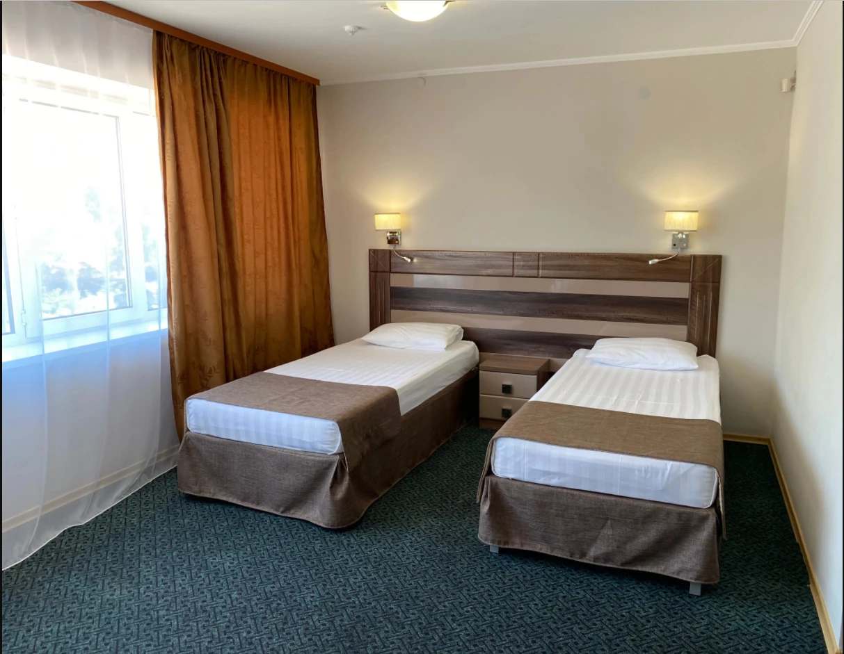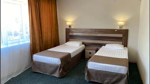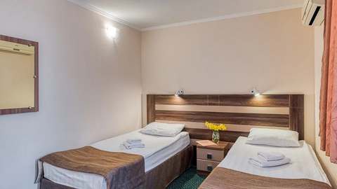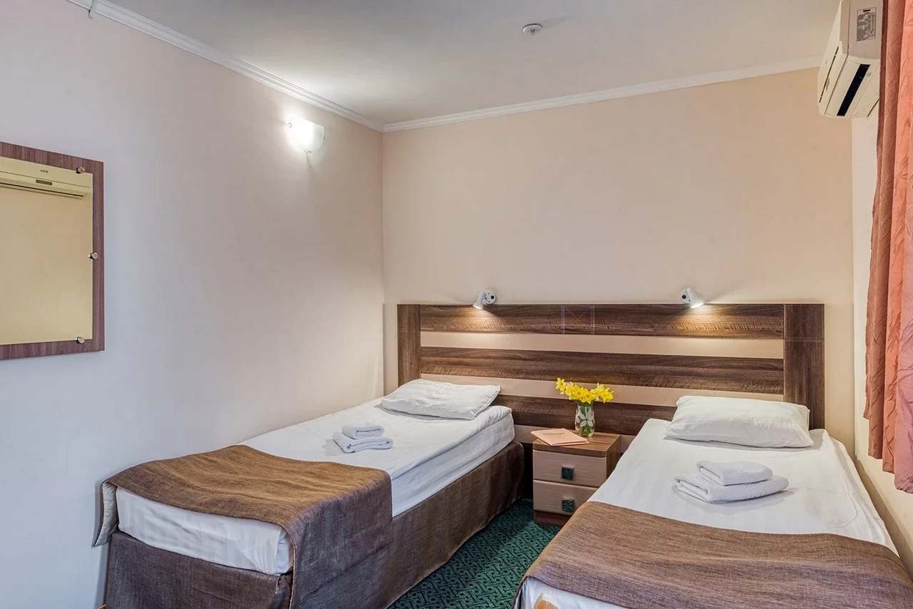 Площадь номера: 12 кв. м. В номере: две односпальные кровати, кондиционер, телевизор, сейф, холодильник; санузел с душем, фен, мини парфюмерия. Номер без балкона с видом на парк. Дополнительное место не предусмотрено. Размещение до 2 человек.