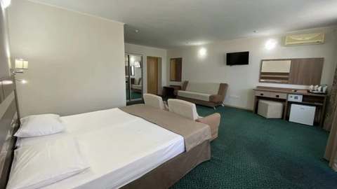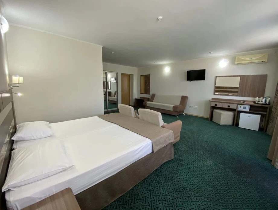 Площадь номера: 31 кв. м. В номере: двуспальная или две односпальные кровати, диван, кондиционер, телевизор, сейф, холодильник; санузел с ванной, фен, мини парфюмерия. Номер с видом на море. Дополнительных мест: 2. Размещение до 4 человек.