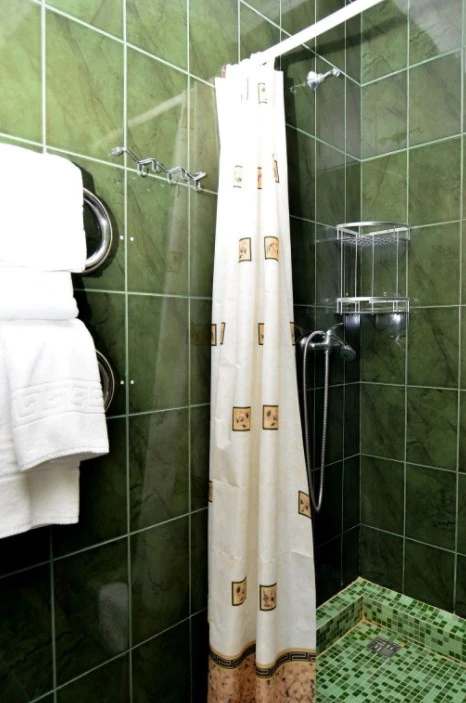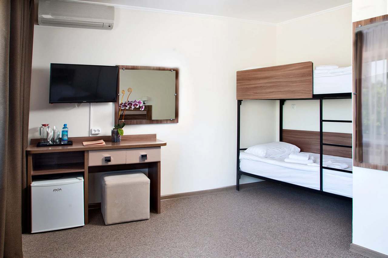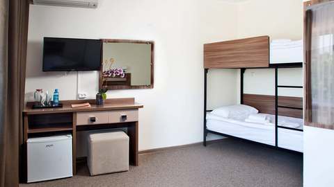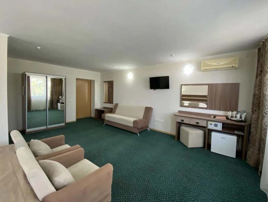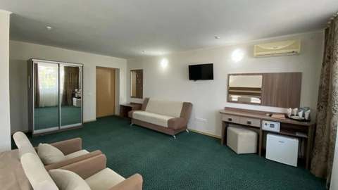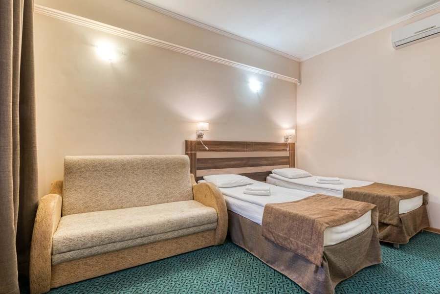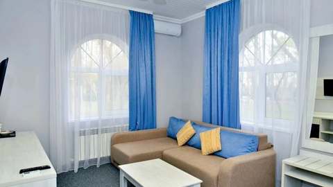 Площадь номера: 40 кв. м. В номере: двуспальная кровать, две односпальные кровати, диван, кондиционер, телевизор, сейф, холодильник, электрочайник; санузел с душем, фен, минипарфюмерия. Номер с отдельным входом, вид на парк. Дополнительные места: кровати, диван. Размещение до 5 человек.