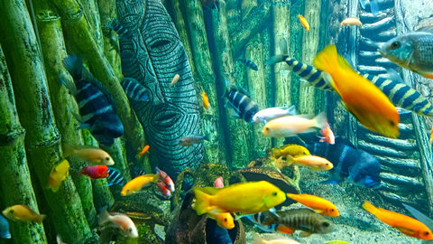 Третий зал, реконструированный в 1990-е годы зал старого аквариума, занимает коллекция пресноводных рыб Африки и Южной Америки. Главные обитатели зала — 1,5-метровые арапаимы, огромные паку и оринокские сомы, арованы и пресноводные скаты. Четвертый зал посвящен различным рептилиям: от черепах (как морских, так и пресноводных) до кайманового крокодила, которые обитают в просторных обогреваемых террариумах. В пятом зале посетители могут познакомиться с обитателями тропической части мирового океана. Неизменно привлекают внимание здесь серые рифовые акулы, мурены, рыба-камень, крылатки, удильщики и многие другие, а также беспозвоночные: морские ежи, актинии и креветки.
