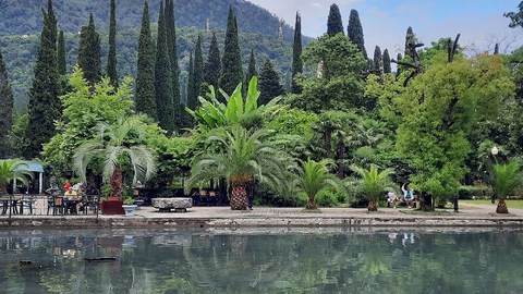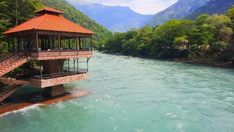 По пути мы также увидим навесной мостик, Голубое озеро, Юпшарский каньон (так называемый «каменный мешок», где скалы нависают под отрицательным уклоном). Отдых у озера Рица. Вокруг озера — высокие горные вершины, покрытые густым дремучим лесом, глубокие ущелья, стремительные горные реки.